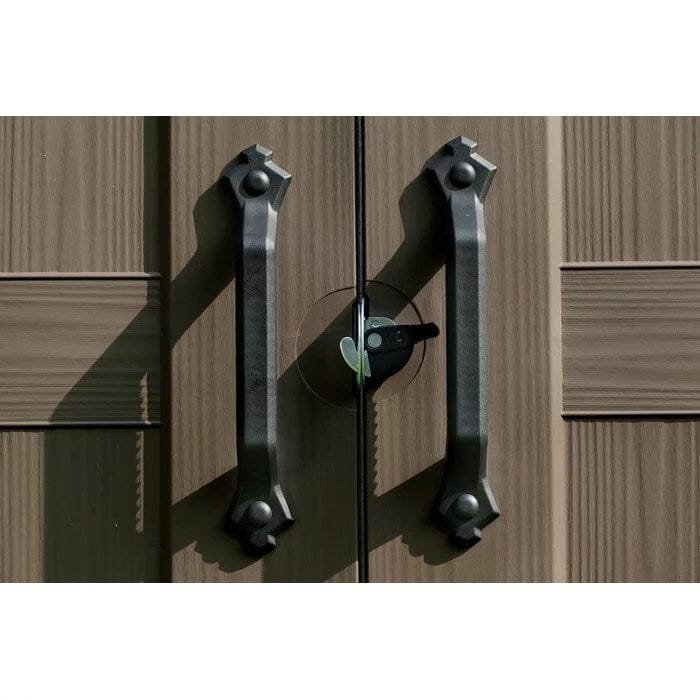 Shed TypeStorage Shed; Bike ShedPrimary MaterialPlasticMaterial DetailsPolypropylene ResinColorBeige/BrownStorage Capacity285 cubic feetFoundation RequiredYesFoundation IncludedNoRecommended Foundation Size98″ W x 71″ DFloor IncludedYesImpact Resistant FlooringYesFloor MaterialResinWindows IncludedYesNumber of Windows1Flexible Window PlacementYesBuilt-In Shelving IncludedYesNumber of Shelves2Ventilation IncludedYesShingles IncludedNoSkylight IncludedYesFlower Box IncludedNoNumber of Doors2Door StyleDouble DoorPadlock Compatible DoorsYesYear-Round UseYesWind Rating65Weather ResistantYesWater ResistantYesUV ResistantYesMildew ResistantYesSupplier Intended and Approved UseResidential UseAssembly