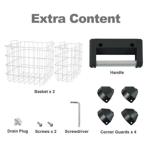 Additionally equipped with replacement handles, corner protectors, drain plugs, screws and screwdriver.