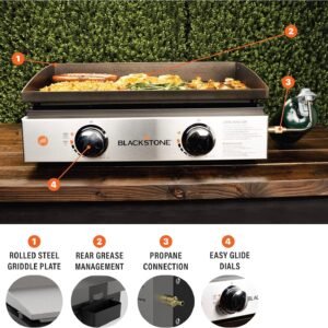 Blackstone 22″ Portable Tabletop Griddle – Dual Burner Flat Top Grill, 24,000 BTU Propane with Stainless Steel Faceplate & Rear Grease System